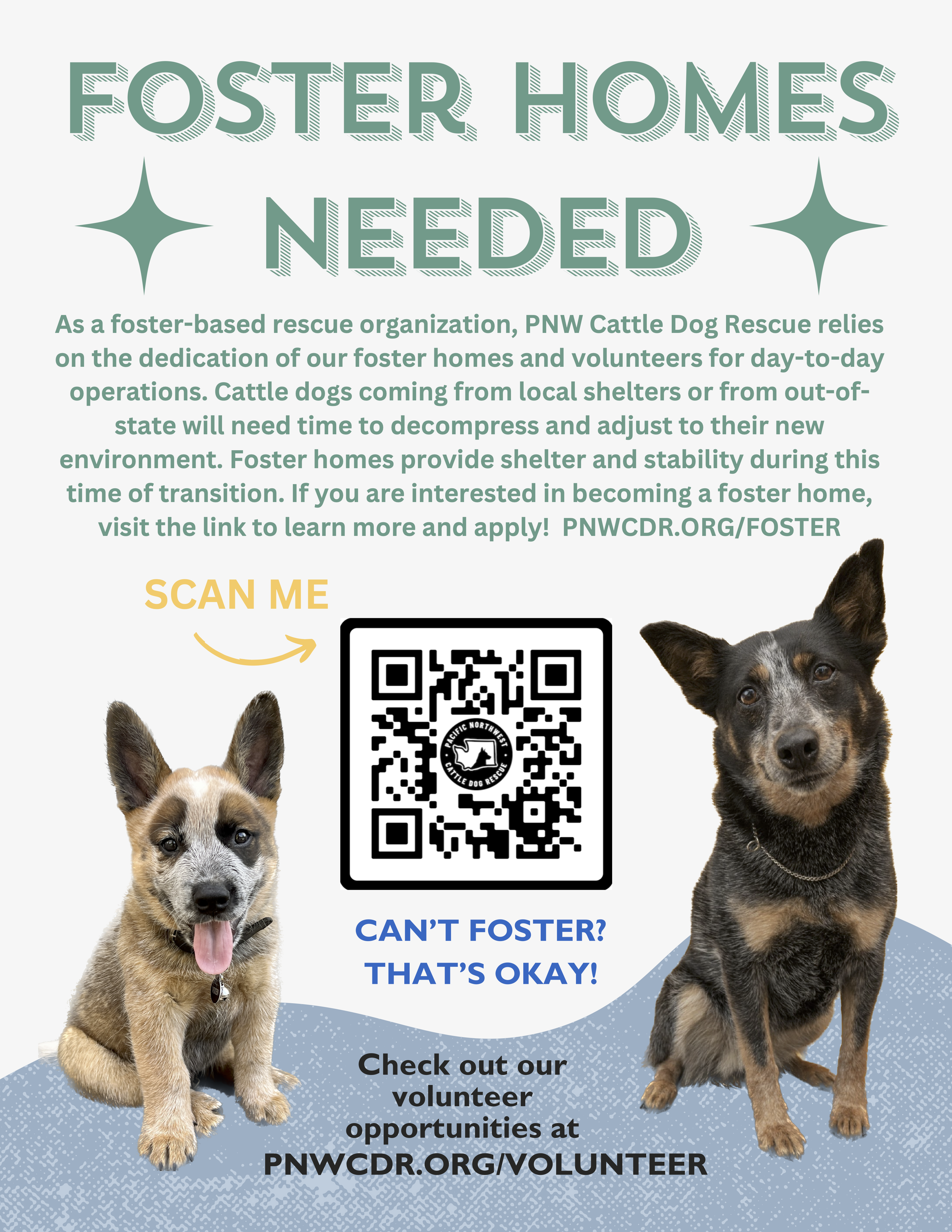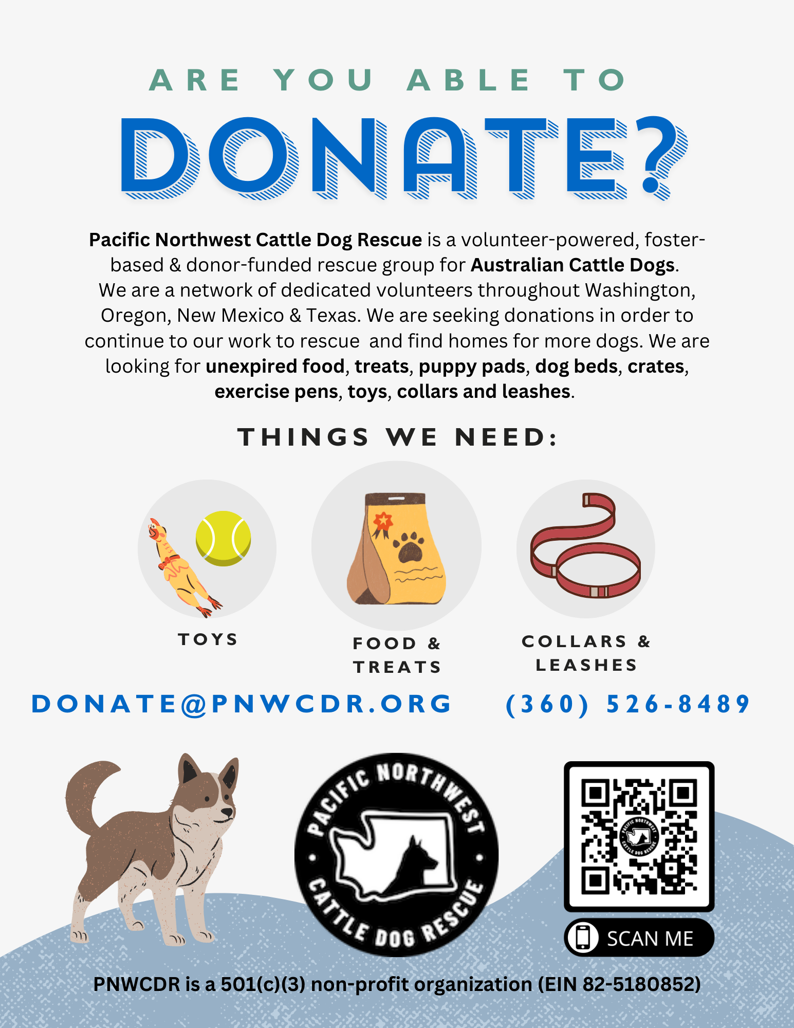 - Items on this wishlist go directly our foster dogs in Corvallis and Salem. Pacific Northwest Cattle Dog Rescue is a volunteer-powered, foster-based & donor-funded rescue group for Australian Cattle Dogs. We are a network of dedicated volunteers and foster homes throughout Washington and Oregon. PNWCDR is a 501(c)(3) non-profit organization (EIN 82-5180852) www.pnwcdr.org