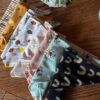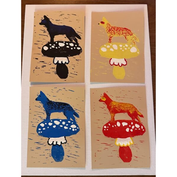 Goodie basket of bandanas, candle, and linoprint artwork