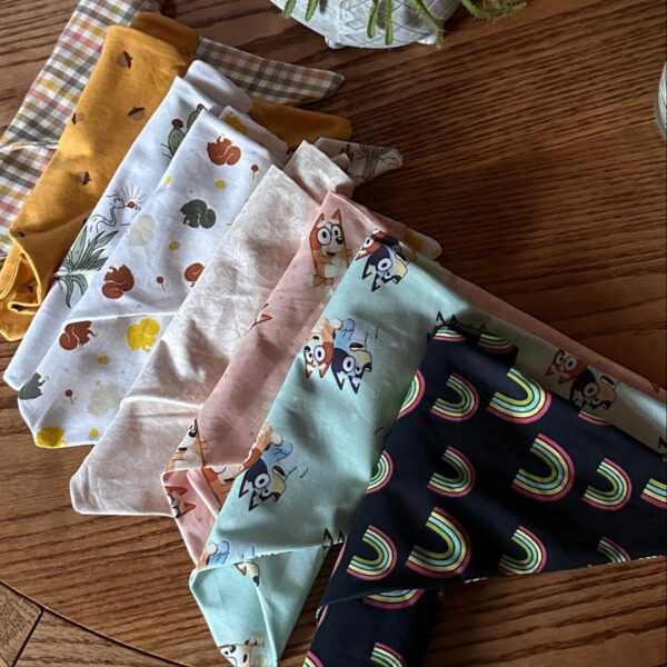 Basket includes 8 handmade bandanas with summer/fall themes, a candle, and cattle dog linoprint/acrylic artwork. Donated by Liz Lazaro.